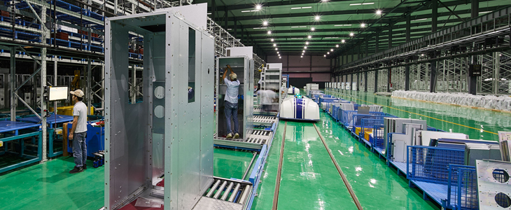 數(shù)字化工廠占地面積185畝,建筑面積5.8萬平方米,共分兩個生產(chǎn)車間,中壓成套生產(chǎn)車間和低壓成套生產(chǎn)車間,主要設備和系統(tǒng)包括:配電設備柔性裝配線、鈑金柔性自動化生產(chǎn)線、庫線一體化銅母線自動加工線、二次線束自動加工線,以及智能物流與倉儲系統(tǒng)、能源管理系統(tǒng)、綜合監(jiān)控系統(tǒng)、數(shù)字化檢測系統(tǒng)等,具備年產(chǎn)5萬面中低壓智能配電設備的能力,并實現(xiàn)公司產(chǎn)品在城市軌道交通等供電系統(tǒng)中的全壽命周期管理,成為聯(lián)通上游供應商和客戶的數(shù)字化運營平臺。
